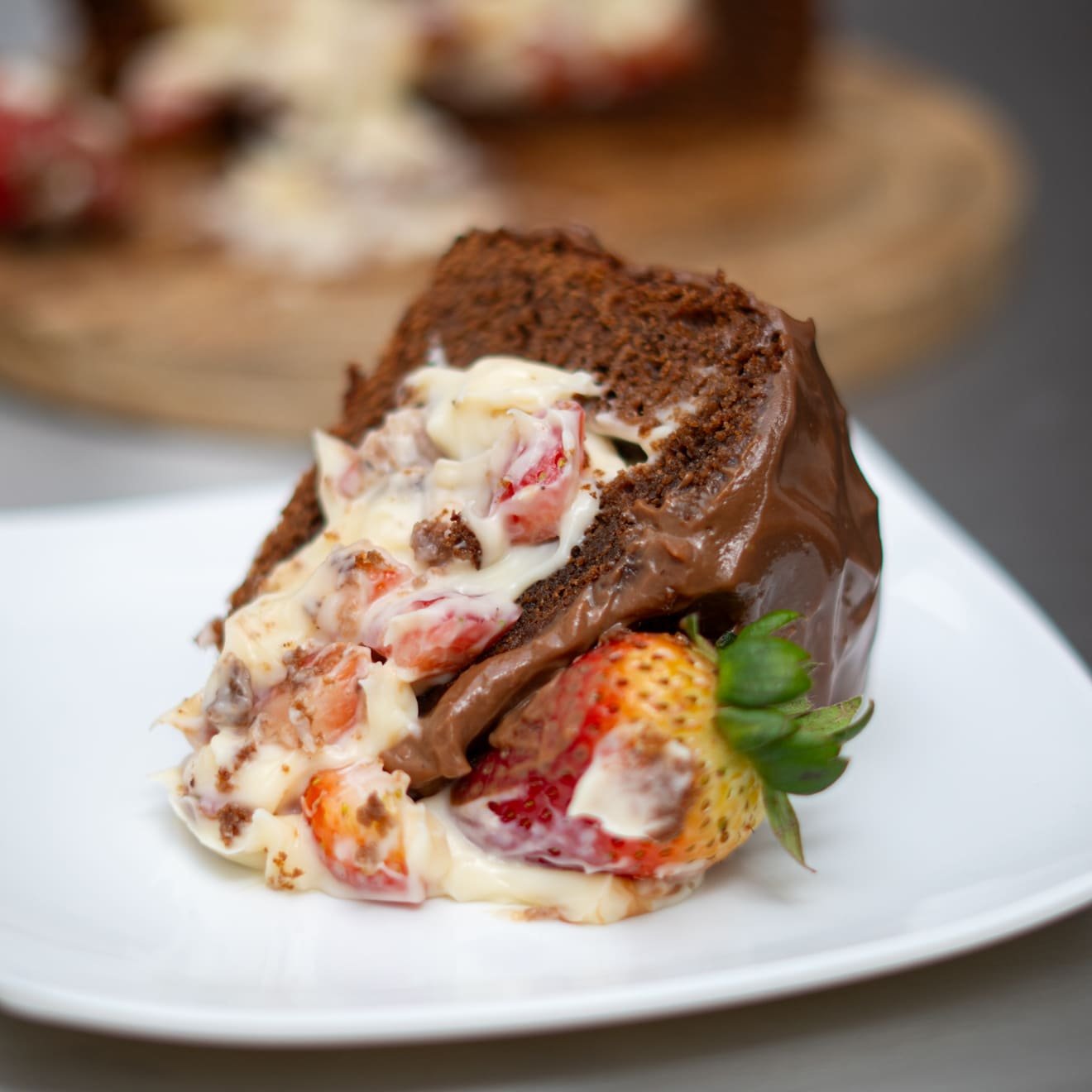 una generosa piscina de crema pastelera suave con frutillas frescas, abrazada por bizcocho de chocolate húmedo y cubierta con una capa sedosa de chocolate brillante.